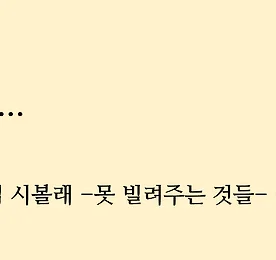 시볼래 단편시집 1-1 해설 : 남자들의 소유욕은 강합니다. 해설 : 좋지도 않은 차 가지고 유세떠는 친구에게 상처받은 작가의 마음이 차를 사겠다는 마음으로 승화되었습니다. 해설 : 대답할 수 없는 질문에 대한 답답함이 영맨에 대한 원망으로 나타나 있습니다. 해설 : 차는 곧 애인입니다. 해설 : 흰색, 검은색, 은색이라는 도로의 현실과 다양한 색상의 자동차가 생기길 바라는 친구의 마음을 표현했습니다. 더보기 이전 1 ··· 1336 1337 1338 1339 1340 1341 1342 ··· 4930 다음