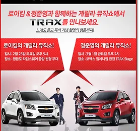 Play the City 쉐보레 트랙스(TRAX), 론칭 이벤트 실시! 쉐보레 트랙스(TRAX) 론칭 이벤트에 참여하세요! 이벤트는 트랙스를 타고 오다! 도심 곳곳에 쉐보레 트랙스 출시를 기념해 다채로운 이벤트가 마련돼 있습니다. 3가지를 소개해 드리니, 꼼꼼하게 챙기셔서 이벤트도 즐기시고 직접 주인공도 되시기 바랍니다~ 로이킴 & 정준영과 함께하는 게릴라 뮤직쇼 쉐보레 트랙스의 스타일리쉬하고 스마트한 이미지와 잘 어울리는 '슈퍼스타 K4'의 두 히어로 로이킴과 정준영이 게릴라 뮤직쇼를 진행합니다. '로이킴의 게릴라 뮤직쇼'는 2월 23일(토) 오후 5시에 영등포 타임스퀘어에서, '정준영의 게릴라 뮤직쇼'는 3월 1일(금) 오후 2시에 코엑스 밀레니엄 광장에서 열립니다. 노래도 듣고 즉석 기념 촬영의 행운까지 누릴 수 있는 기회라는 생각이 드네요. 보다 자세한 내용은 트랙스.. 더보기 이전 1 ··· 2227 2228 2229 2230 2231 2232 2233 ··· 4930 다음