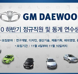 즐거운 월요일 아침입니다. 좋은 소식이 있어 여러분들께 전해 드립니다. 지엠대우에서 새 가족을 모집하는 채용소식이에요. 2010 하반기 정규직원 및 동계 연수생 모집합니다. 2010년 11월 4일부터 11월 10일까지 연구개발, 디자인, 생산기술, 제품기획, 해외영업, 품질 등의 분야에서 공개채용합니다. 신입사원은 4년제 대졸 이상 학력 소지자 및 2011년 2월 졸업 예정자이며, 경력사원은 모집 분야 관련 경력을 보유하고 있으면 지원이 가능합니다. 보다 자세한 채용 정보는 아래의 내용을 참조해 주세요. ● 모집 분야 및 지원 가격 모집분야 경력구분 모집 전공 채용 인원 근무지 연구개발 차량설계, Validation, Safety & CAE, 차량성능개발, Veh. Package, Architecture..