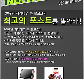 2009년 지엠대우 톡 블로그의 최고의 포스트를 뽑아주세요 지엠대우 톡이 여러분을 찾아뵙게 된지 이제 4개월이 지났습니다. 4개월 동안 300건의 포스트와 1,000건 이상의 댓글 그리고, 137건의 트랙백이 작성되었습니다. 여러분의 성원에 감사드립니다. 앞으로도 지엠대우톡 블로그에 많은 관심 부탁드립니다. 그런 의미에서 2009년 한 해를 정리하는 의미와 2010년에도 더 좋은 포스트로 찾아뵙겠다는 다짐으로 독자분들과 함께하는 2009년 마지막 이벤트를 준비했습니다. Mission :: 2009년 지엠대우 톡 블로그의 최고의 포스트를 뽑아주세요 쉽죠? 다시한번 이벤트 내용을 정리해드리면, 2009년 지엠대우 톡 블로그에서 본인이 가장 좋았던 포스트를 선정해 주시고 그 이유를 그리고, 2010년 지엠대우 톡 블로그에서 다뤘으면 하는 생각을 이 이벤트 공지 포스트.. 더보기 이전 1 ··· 4613 4614 4615 4616 4617 4618 4619 ··· 4930 다음